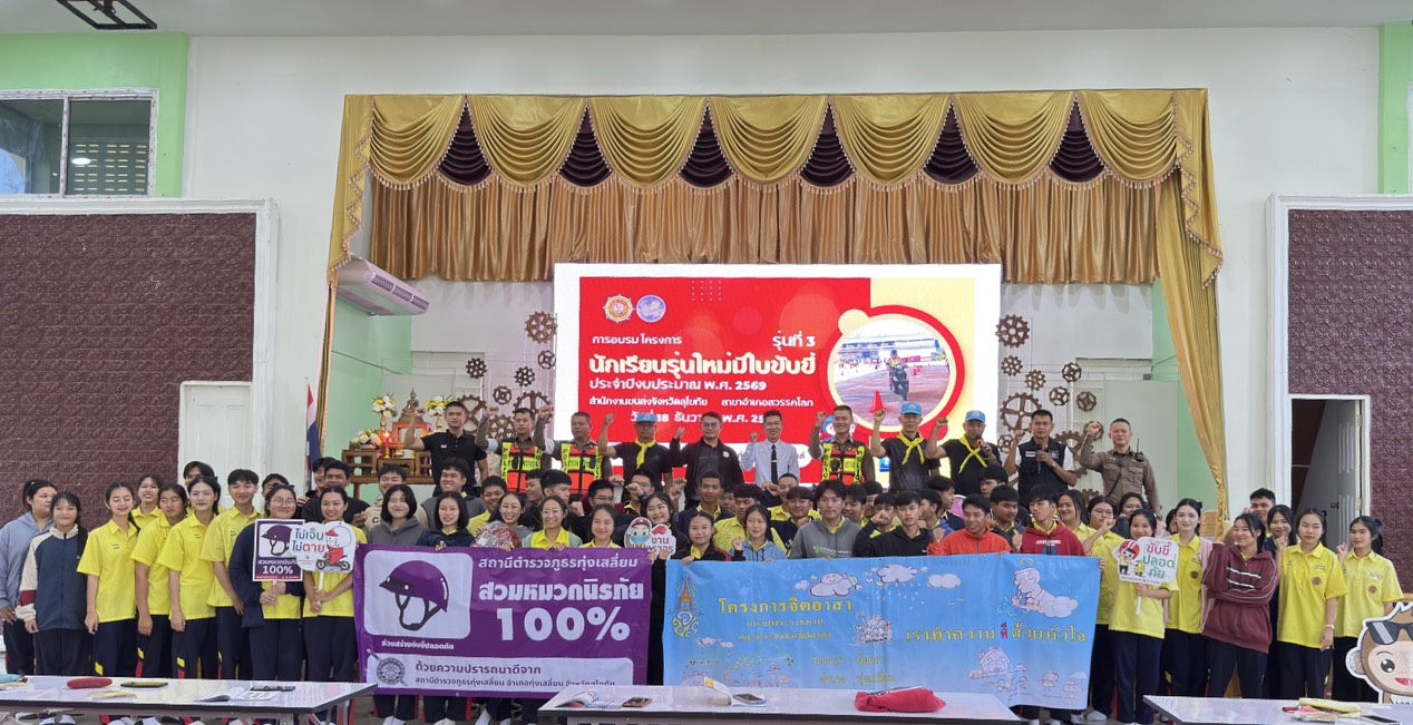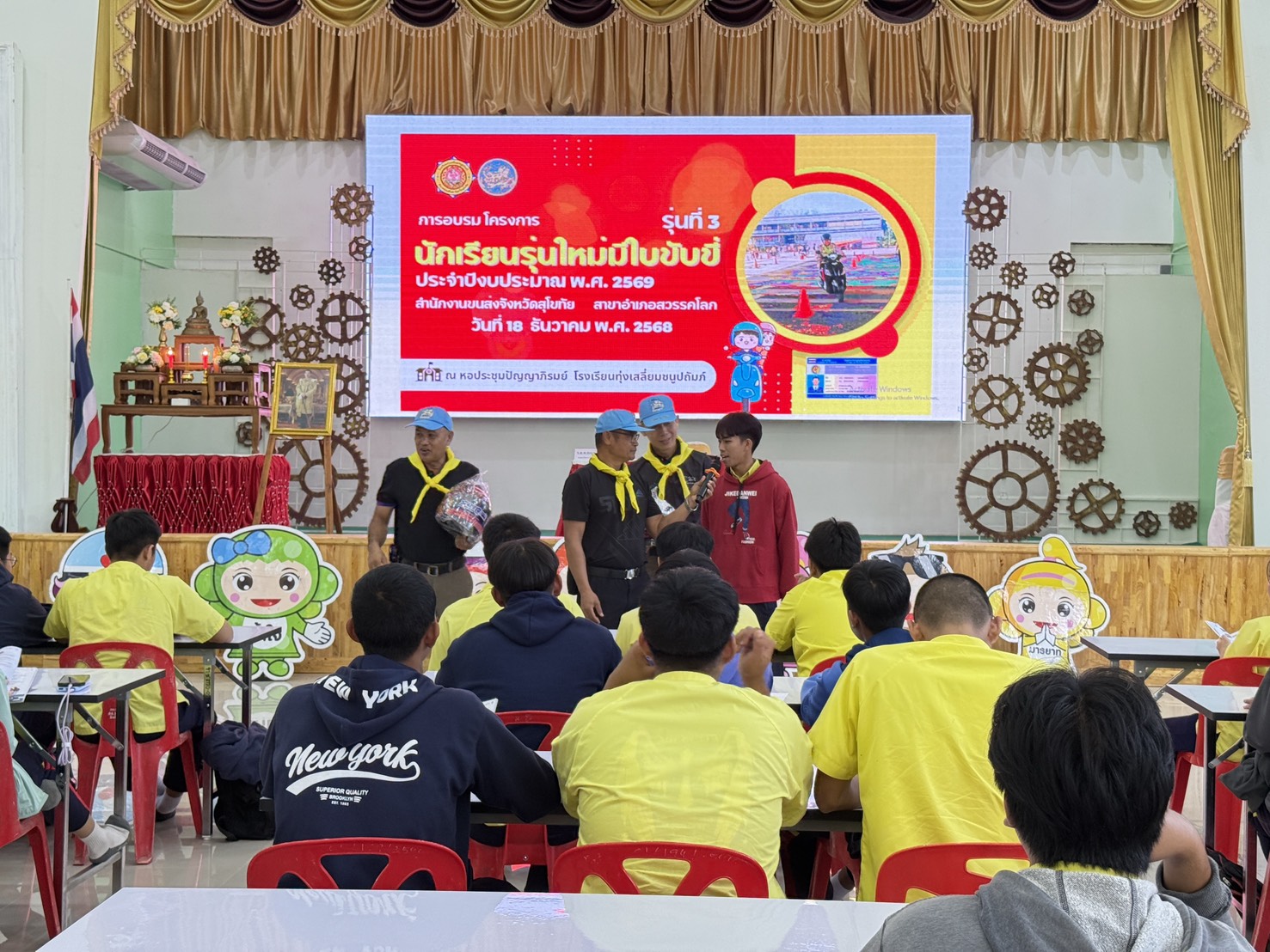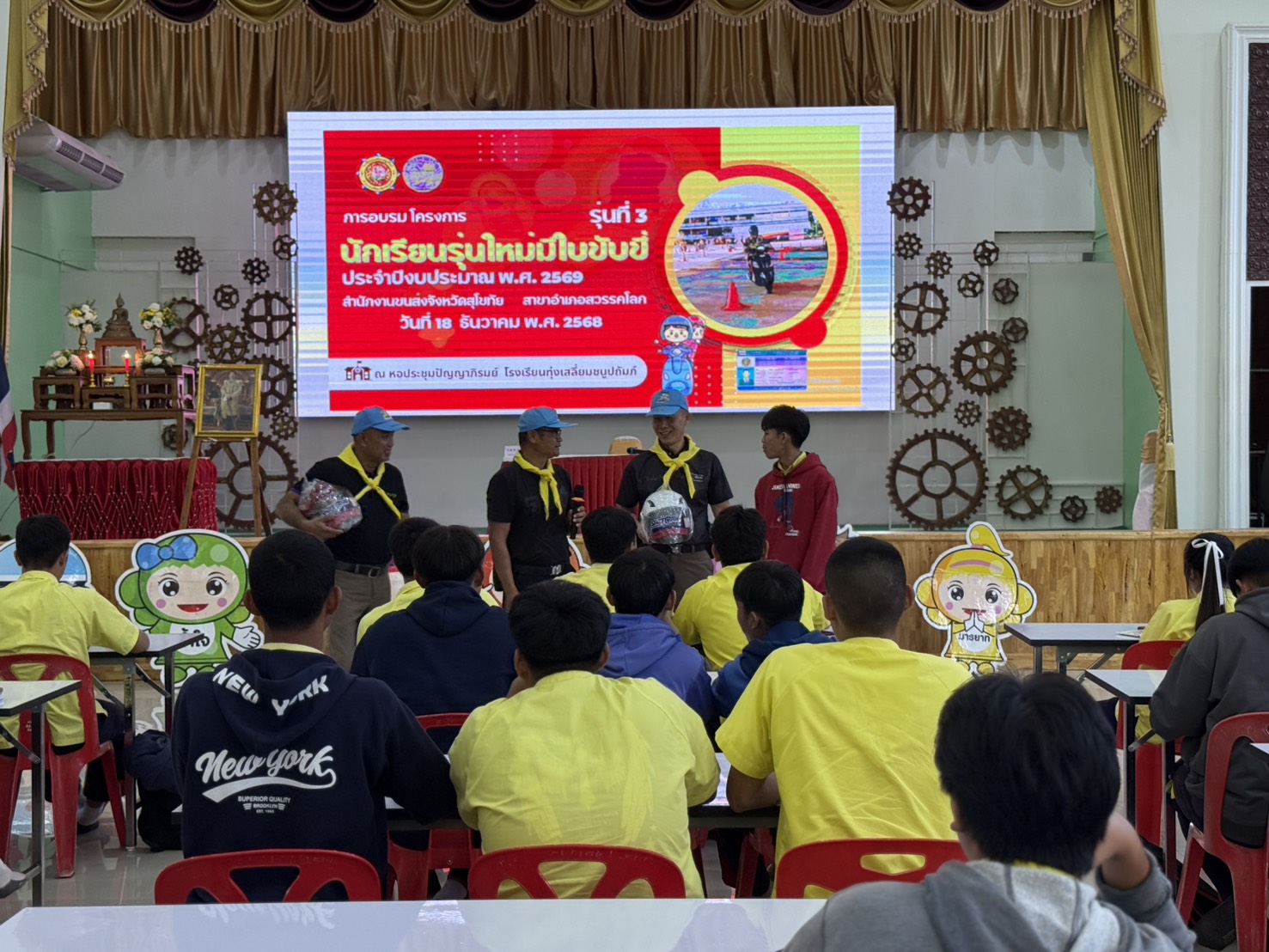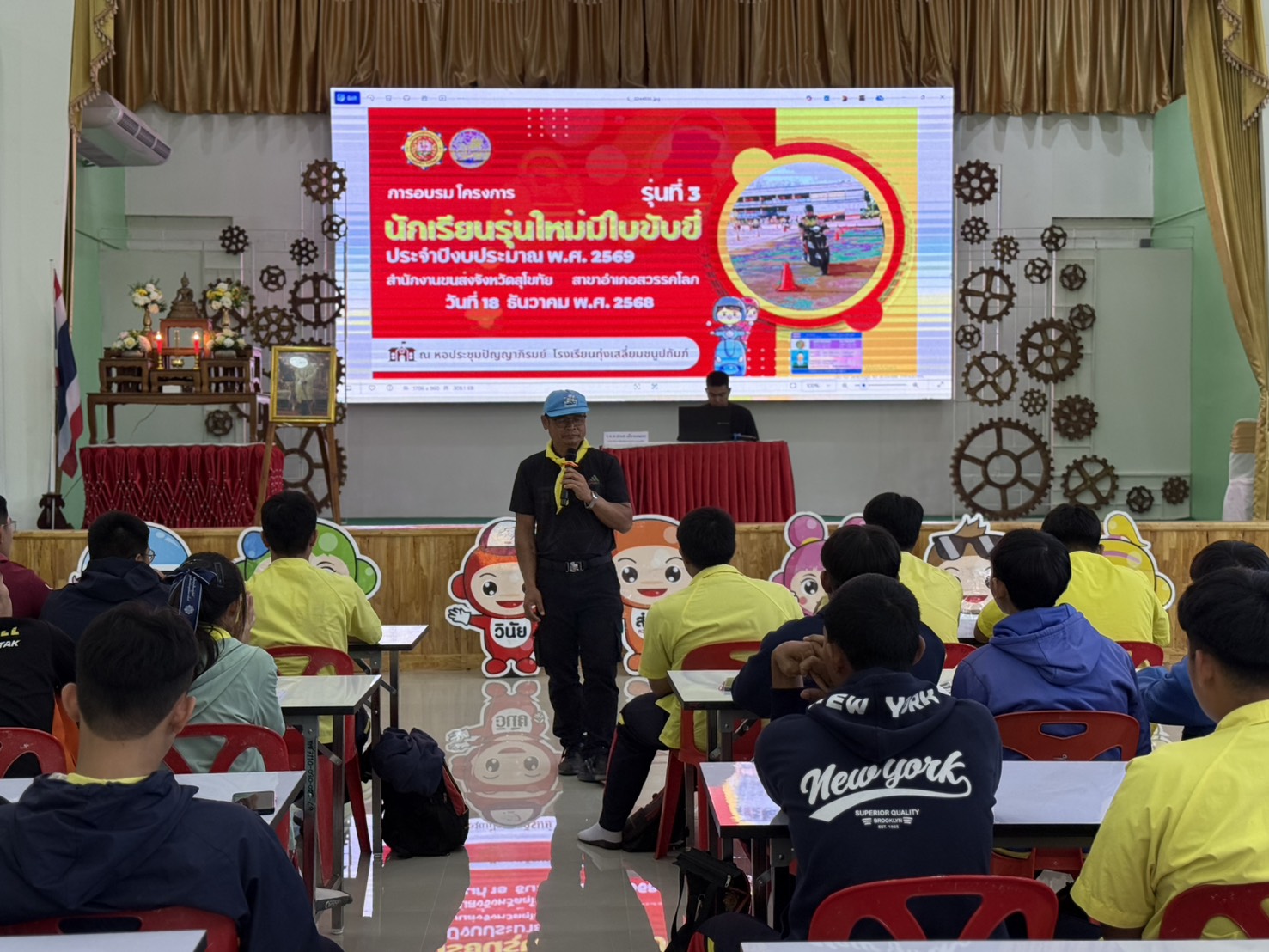 วันนี้ (26ธ.ค.68) เวลา 10:30น. ภายใต้การอำนวยการสั่งการของ พ.ต.อ.ธีรณัจต์ เมธาอรรถพงศ์ ผกก.สภ.ทุ่งเสลี่ยม ,พ.ต.ท.ลำพูน เคลือบวงค์ รอง ผกก.ป.สภ.ทุ่งเสลี่ยม มอบหมายให้ พ.ต.ท.กำพล จันทร์ฉาย สวป.สภ.ทุ่งเสลี่ยม ,พ.ต.ต.สัญญาบุญหลัง สว.อก.สภ.ทุ่งเสลี่ยม พร้อมด้วยชุดจราจร สภ.ทุ่งเสลี่ยมและข้าราชการตำรวจจิตอาสา รณรงค์บรรยายให้ความรู้ในโครงการขับขี่ ปลอดภัย ป้องกันการเกิดอุบัติเหตุ ในช่วงเทศกาลปีใหม่ 2569 ให้กับนักเรียนโรงเรียนทุ่งเสลี่ยมชนูปถัมภ์ ณ หอประชุมปัญญาภิรมย์ โรงเรียนทุ่งเสลี่ยมชนูปถัมภ์
