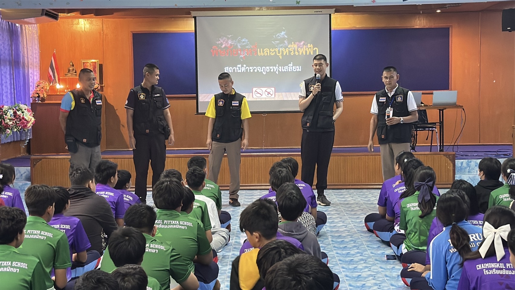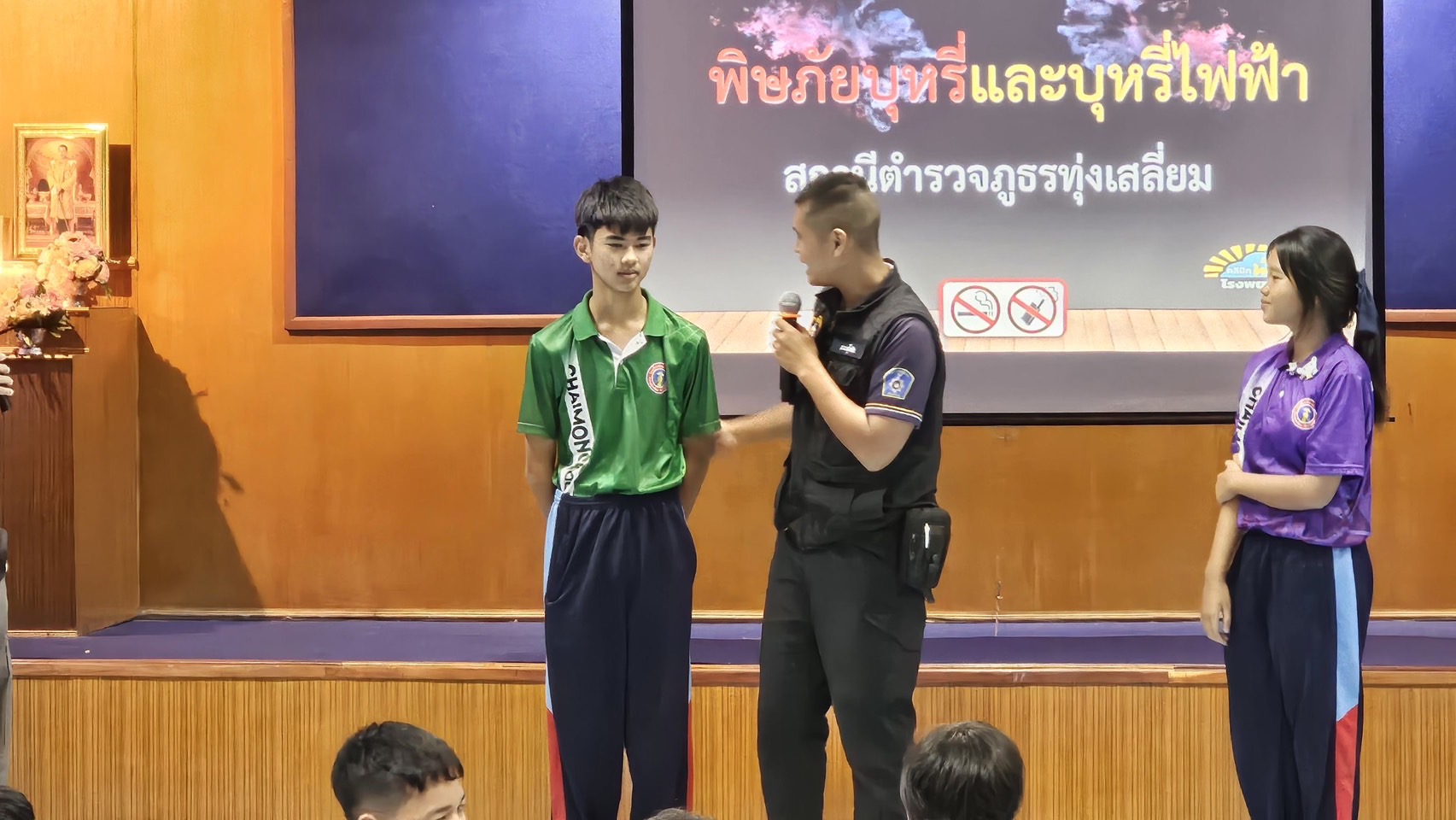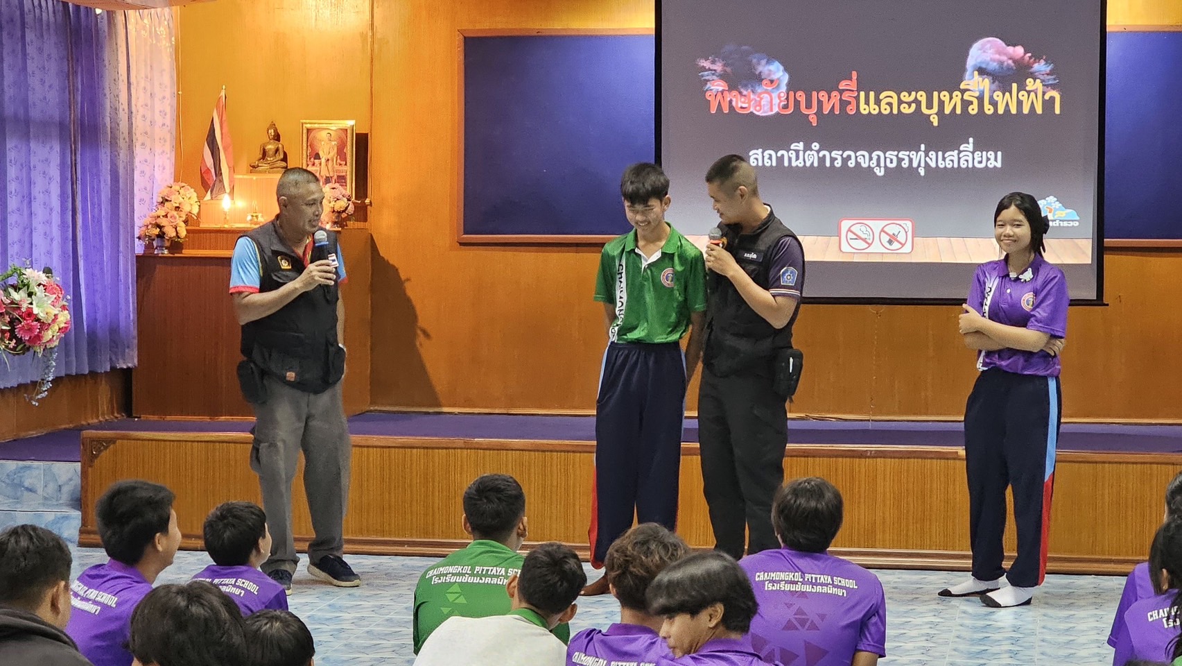 วันที่ 9ก.ย.68 เวลา 13.00น. ภายใต้การอำนวยการของ พ.ต.อ.ธีรณัจต์ เมธาอรรถพงศ์ ผกก.สภ.ทุ่งเสลี่ยม ,พ.ต.ท.อิทธ์ฉัตรชัย เรืองชัยศิวเวท รอง ผกก.ป.สภ.ทุ่งเสลี่ยม, พ.ต.ต.ธัญศิษฐ์ โพธิ์เรือง สวป.สภ.ทุ่งเสลี่ยม มอบหมายให้ ร.ต.อ.นพดล คำจินดา รอง สว.(ป.)สภ.ทุ่งเสลี่ยม พร้อมด้วยชุดปฏิบัติงาน ชมส. บรรยายให้ความรู้เกี่ยวกับบุหรี่ไฟฟ้าให้กับนักเรียนชั้นมัธยมศึกษาตอนต้น ณ ห้องประชุม ร.ร.ชัยมงคลพิทยา การดำเนินการเป็นไปด้วยความเรียบร้อย