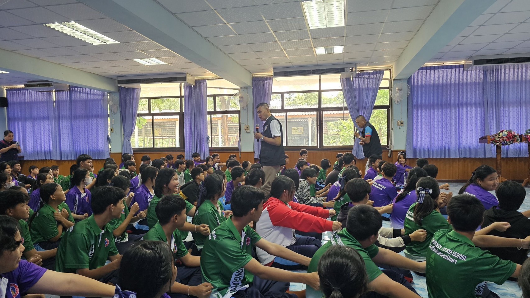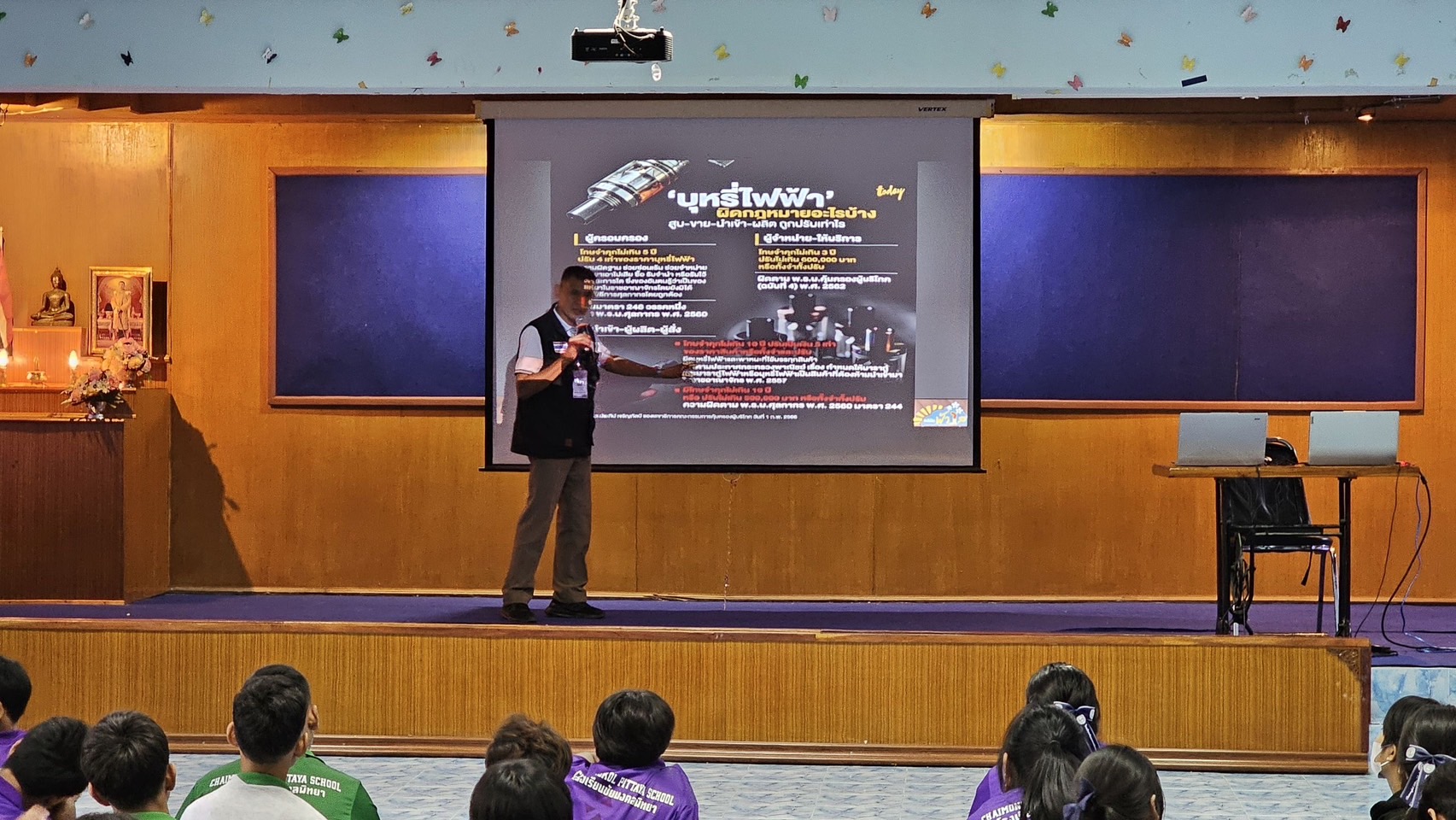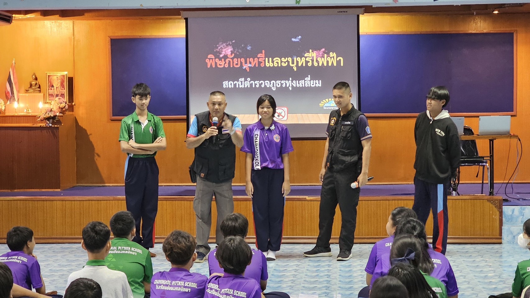 วันที่ 9ก.ย.68 เวลา 13.00น. ภายใต้การอำนวยการของ พ.ต.อ.ธีรณัจต์ เมธาอรรถพงศ์ ผกก.สภ.ทุ่งเสลี่ยม ,พ.ต.ท.อิทธ์ฉัตรชัย เรืองชัยศิวเวท รอง ผกก.ป.สภ.ทุ่งเสลี่ยม, พ.ต.ต.ธัญศิษฐ์ โพธิ์เรือง สวป.สภ.ทุ่งเสลี่ยม มอบหมายให้ ร.ต.อ.นพดล คำจินดา รอง สว.(ป.)สภ.ทุ่งเสลี่ยม พร้อมด้วยชุดปฏิบัติงาน ชมส. บรรยายให้ความรู้เกี่ยวกับบุหรี่ไฟฟ้าให้กับนักเรียนชั้นมัธยมศึกษาตอนต้น ณ ห้องประชุม ร.ร.ชัยมงคลพิทยา การดำเนินการเป็นไปด้วยความเรียบร้อย