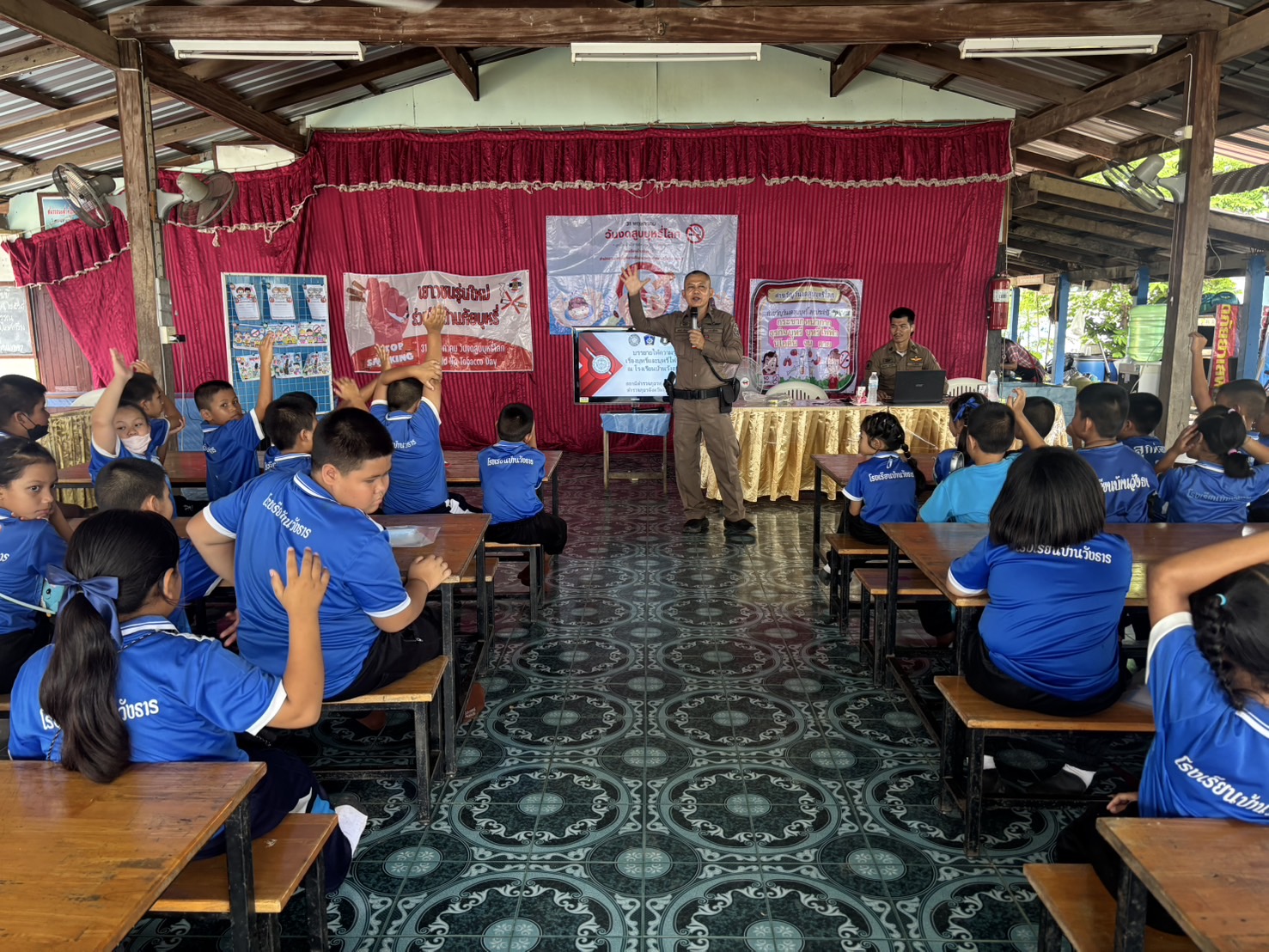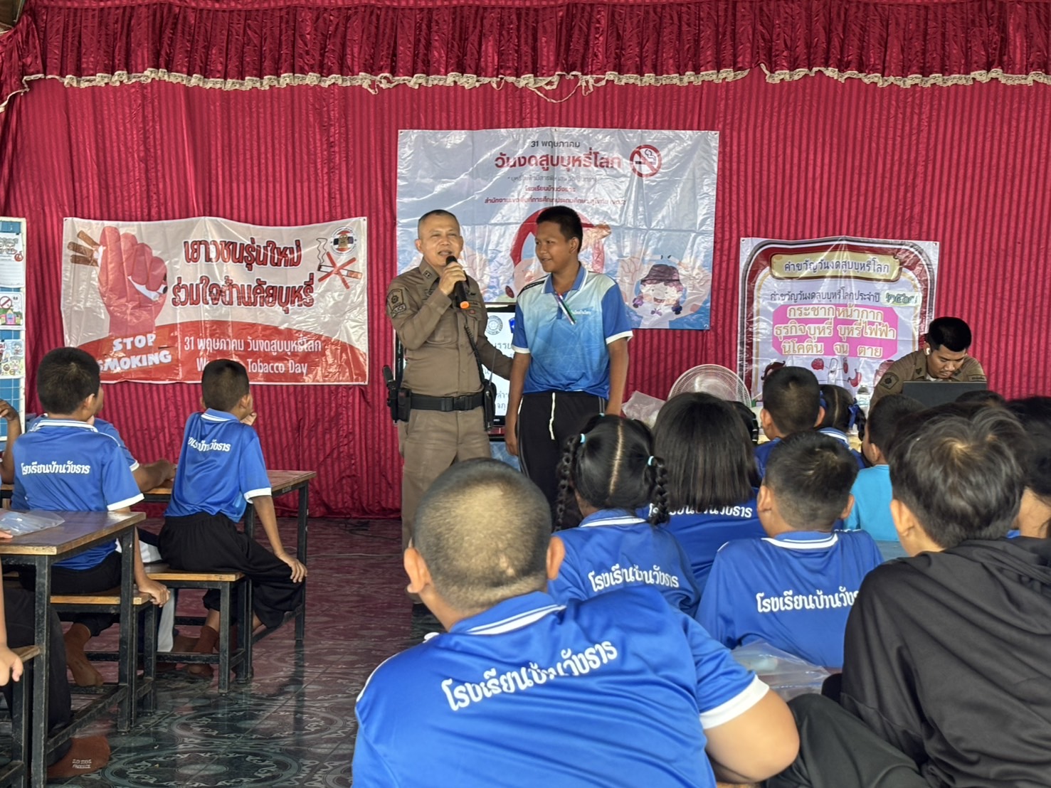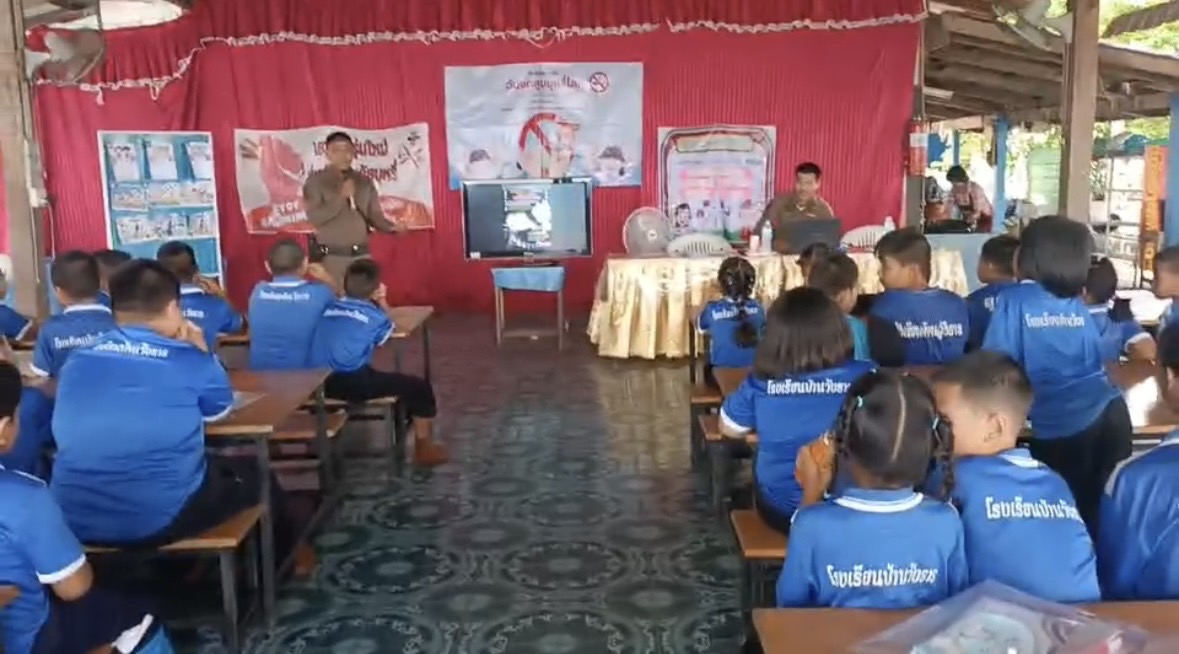 วันนี้( 29พ.ค.68 ) ภายใต้การอำนวยการของ พ.ต.อ.ธีรณัจต์ เมธาอรรถพงศ์ ผกก.สภ.ทุ่งเสลี่ยม มอบหมายให้ร.ต.อ.สมโภชน์ เพ็งเนียม รอง สวป. สภ.ทุ่งเสลี่ยม พร้อมด้วย สายตรวจรถยนต์ บรรยายให้ความรู้ ในเรื่องบุหรี่ และบุหรี่ไฟฟ้าให้กับนักเรียนโรงเรียนบ้านวังธาร ณ หอประชุมโรงเรียนบ้านวังธารอำเภอทุ่งเสลี่ยม จังหวัดสุโขทัย การดำเนินการเป็นไปด้วยความเรียบร้อย
