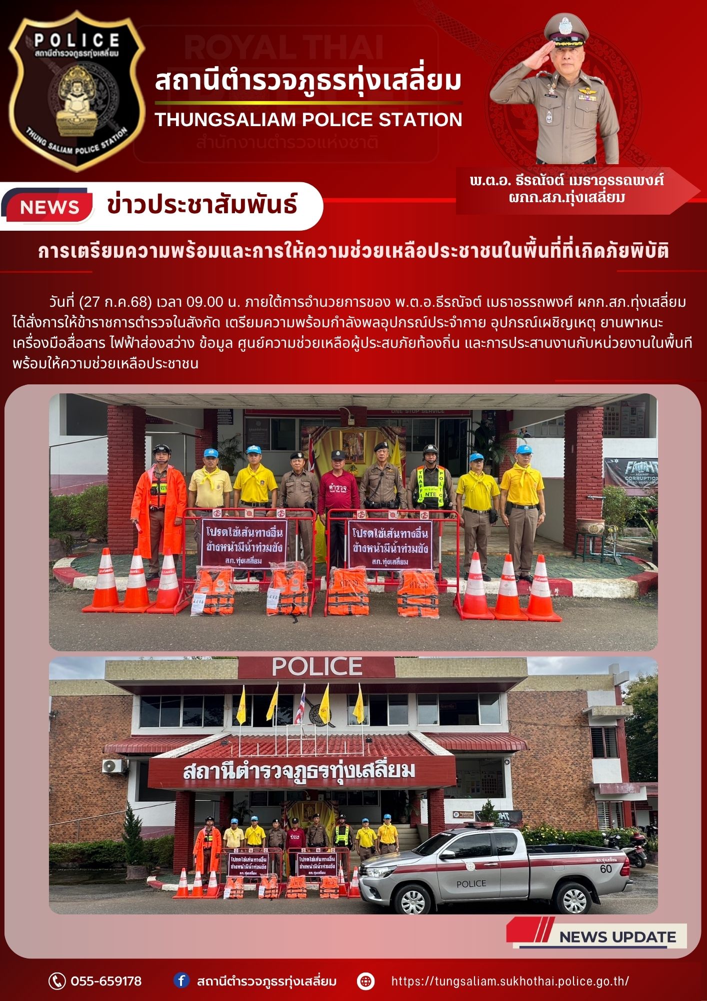 วันที่ (27 ก.ค.68) เวลา 09.00 น. ภายใต้การอำนวยการของ พ.ต.อ.ธีรณัจต์ เมธาอรรถพงศ์ ผกก.สก.สก.ทุ่งเสลี่ยม ได้สั่งการให้ข้าราชการตำรวจในสังกัด เตรียมความพร้อมกำลังพลอุปกรณ์ประจำกาย อุปกรณ์เผชิญเหตุ ยานพาหนะ เครื่องมือสื่อสาร ไฟฟ้าส่องสว่าง ข้อมูล ศูนย์ความช่วยเหลือผู้ประสบภัยท้องถิ่น และการประสานงานกับหน่วยงานในพื้นที่พร้อมให้ความช่วยเหลือประชาชน