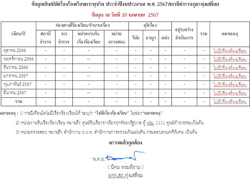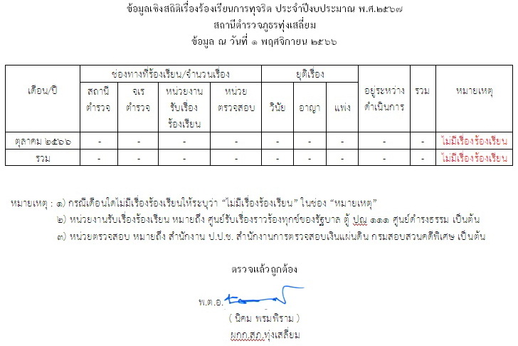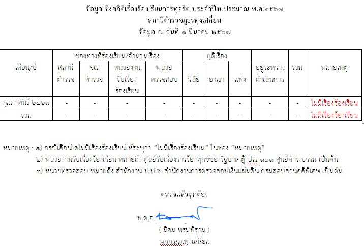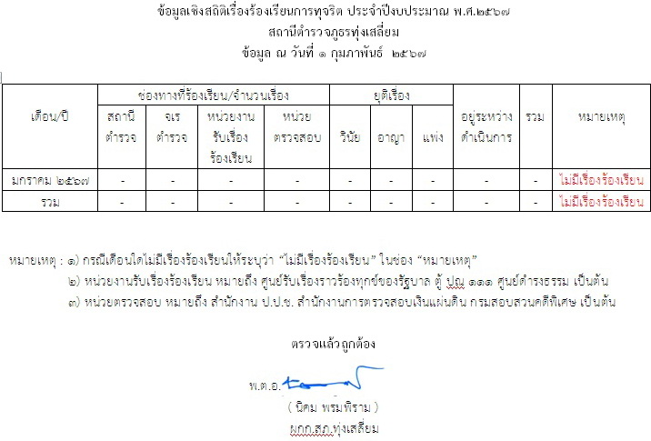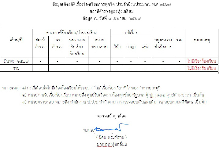ข้อมูลเชิงสถิติเรื่องร้องเรียนการทุจริต ประจำปีงบประมาณ พ.ศ. 2567 สถานีตำรวจภูธรทุ่งเสลี่ยม
