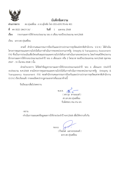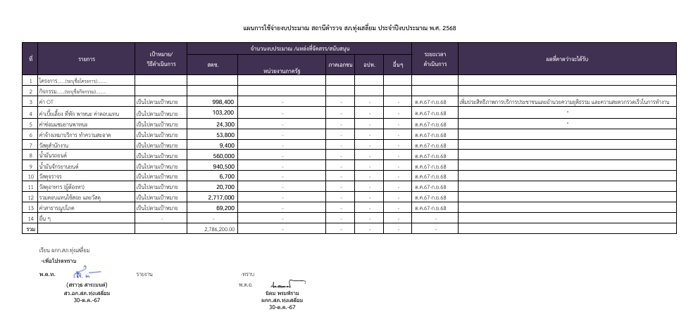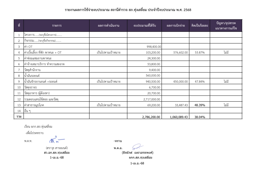 O12 แผนการใช้จ่ายงบประมาณประจำปีและการรายงานผล 27 มกราคม 2568 โดย tungsaliam_db / ไม่มีหมวดหมู่ แผนการใช้จ่ายงบประมาณ สถานีตำรวจ สภ.ทุ่งเสลี่ยม ประจำปีงบประมาณ พ.ศ. 2568 ข้อมูล ณ วันที่ 30 ตุลาคม 2567 [ Excel ] [ PDF ] รายงานผลการใช้จ่ายงบประมาณ สถานีตำรวจ สภ.ทุ่งเสลี่ยม ประจำปีงบประมาณ พ.ศ. 2568 ข้อมูล ณ วันที่ 1 เมษายน 2568 [ Excel ] [ PDF ] บันทึกข้อความงบประมาณค่าใช้จ่าย 2568 [ WORD ] [ PDF ] FacebookFacebookXXLINELine